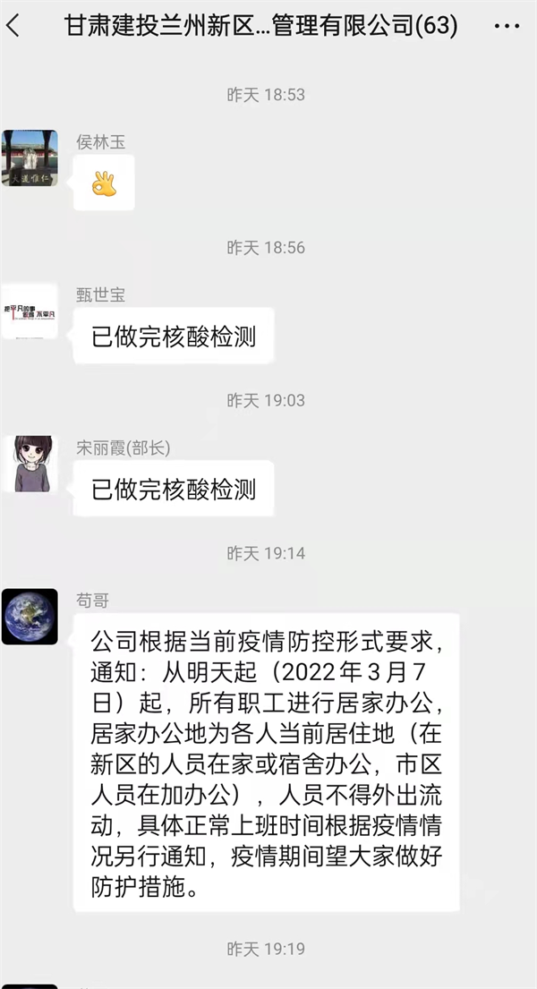 3月6日,蘭州新區(qū)出現(xiàn)5例新冠肺炎確診病例,蘭州新區(qū)立即啟動(dòng)疫情防控應(yīng)急處置機(jī)制,面對(duì)突如其來(lái)的疫情,新區(qū)公司高度重視,快速行動(dòng),立即響應(yīng)蘭州新區(qū)新冠肺炎疫情防控安排部署,要求全體員工按照中川園區(qū)發(fā)布的緊急通告,向公司和社區(qū)報(bào)備個(gè)人近期活動(dòng)軌跡,篩查與確診病例活動(dòng)軌跡有交集的人員,做好自我健康監(jiān)測(cè)、核酸檢測(cè),居家不外出。