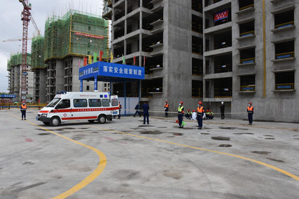 本次演練分為“人員墜樓”、“觸電事故”、“火災(zāi)事故”三個(gè)科目。演練模擬施工作業(yè)人員不慎墜樓、現(xiàn)場(chǎng)施工作業(yè)人員意外觸電、施工現(xiàn)場(chǎng)出現(xiàn)火災(zāi)等項(xiàng)目施工現(xiàn)場(chǎng)常見的生產(chǎn)安全事故。隨著施工現(xiàn)場(chǎng)“快來(lái)人呀、救人呀”的呼救聲,項(xiàng)目部立即啟動(dòng)應(yīng)急救援預(yù)案,應(yīng)急救援各組迅速抵達(dá)現(xiàn)場(chǎng),疏散組、搶救組、后勤組、救護(hù)組、調(diào)度組等迅速投入事故現(xiàn)場(chǎng),在事故面前臨危不亂,有序進(jìn)行現(xiàn)場(chǎng)警戒、安全疏散、扶持傷員撤離,整個(gè)救援演練過(guò)程緊張有序,貼近實(shí)際,場(chǎng)景逼真。