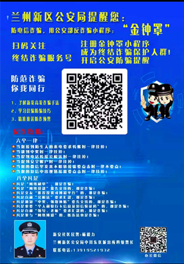 據悉,甘肅建投新區公司歷來重視員工反電信網絡詐騙的教育宣傳工作,與轄區派出所建立了良好的合作關系,積極配合派出所在甘肅建投蘭州新區產業園區內的相關工作順利開展,公司員工現已全員注冊公安部反詐騙微信小程序“金鐘罩”。