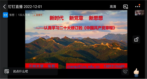 蔡文成教授以《深入學習貫徹黨的二十大精神》為題,從深刻認識黨的二十大重大意義、深刻領會以中國式現代化推進中華民族偉大復興的根本任務、深刻領會以偉大自我革命引領偉大社會革命的重要要求、牢牢把握團結奮斗的時代要求等方面深入淺出地對黨的二十大精神進行了全面、系統的解讀。張哲教授以《新黨章新思想》為題,從過去中國非凡十年的發展、牢牢把握新時代中國特色社會主義思想的世界觀和方法論、全面從嚴治黨的重大意義等方面闡釋了新黨章中的新觀點、新思想。