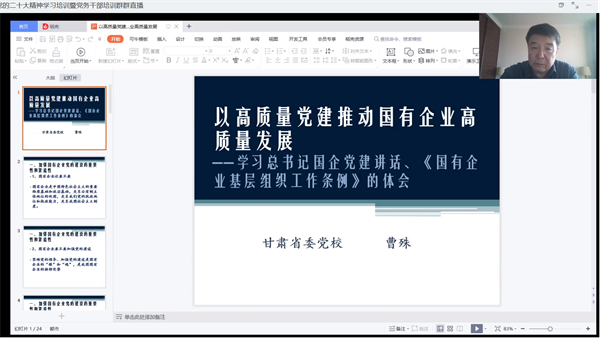 劉景龍部長以《黨支部工作實務培訓》為題,從黨務工作基本知識,黨支部設立、換屆調整等工作,支部組織生活,發展黨員工作等方面為大家詳細講解了支部日常工作中的工作方法與對策。曹殊教授以《高質量黨建推動國有企業高質量發展》為題,圍繞深入學習貫徹全國國企黨建工作會精神、加強國有企業黨的建設的重要性和緊迫性、解讀《國有企業基層組織工作條例》等方面進行了詳細講解。