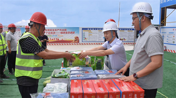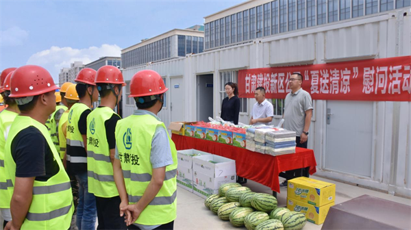 7月15日,新區公司舉行“夏送清涼”慰問活動,看望慰問了酷暑天仍堅守在項目一線的職工,并為他們送去茶葉、冰糖、防暑飲料等慰問品。新區公司總經理蘇立軍、相關部門負責人及工作人員參加了慰問活動。