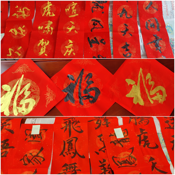 在活動現場,翰墨飄香、喜慶吉祥。擅長和愛好書法的同事揮毫潑墨,盡展所長。一幅幅風格迥異的春聯,一個個大大的“福”字,帶著美好的寓意,紅底金格黑字飄著濃濃墨香紅紅火火地展現在大家面前。