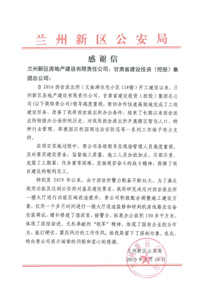 感謝信 新區公司在2016年承建了蘭州新區文曲湖景園住宅小區項目,該項目面臨著工期緊、任務重的挑戰,但在新區公司的科學管理下,及時落實建設資金,強化施工現場管理,保證施工的安全質量,優質高效地完成了各項工程任務。其中蘭州新區西岔派出所(蘭州新區文曲湖住宅小區11#樓)的順利完工,更是結束了西岔派出所長期租借辦公場所的歷史,有效改善了西岔派出所的辦公條件。 今年,新區公司為順利完成西岔派出所一樓大廳的功能區域升級改造工程,嚴格按照蘭州新區公安局的相關要求,積極配合調整施工方案,嚴格按照工期節點,組織施工人員加班加點,實現了在短短一個月的時間完成一樓大廳的改造裝修和設備調試工作,增補修建了值班室、接警臺,擴展了派出所的服務空間,優化了大廳的結構布局,甘肅建投擔當作為、雷厲風行的工作作風,得到了蘭州新區公安局和西岔派出所的肯定和贊許。 由此,可以看出甘肅建投具有能吃苦、能戰斗、能奉獻的優良作風,更體現了新區公司具有良好的項目管理水平。新區公司將繼續遵循甘肅建投“匠心營造、精益求精”的理念,為甘肅建投的高質量發展再立新功。 (通訊員:班展昭) |