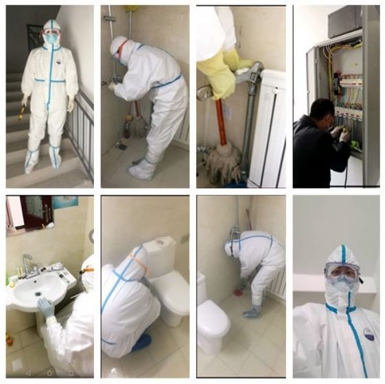 近500個房間的水、電、暖維修以及臨時帳篷的通水、通電,諸如地漏排水不暢、燈管燒壞、防水滲漏、暖氣不熱、房內無熱水等問題時不時發生,門把手壞了、電冰箱接電、帳篷接電等等,這些高強度、快節奏的維修工作,一樁樁、一件件無不需要維修人員進行處理,每一個環節、每一個細節容不得絲毫麻痹松懈、馬虎大意,穿著防護服作業,這無疑又給他們的工作增加了難度。