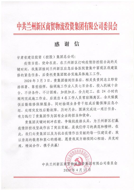 4月15日,一封字里行間滿懷真摯感謝的文件送到甘肅建投新區公司,文件中向甘肅建投的每一名建設者、維保者和工作人員致以崇高的敬意和衷心的感謝,這是全體人員無私付出贏得的嘉獎,這是共產黨員“守初心、擔使命”形成合力取得的成績,這是甘肅建投沖在第一線“戰疫”樹起的榜樣。